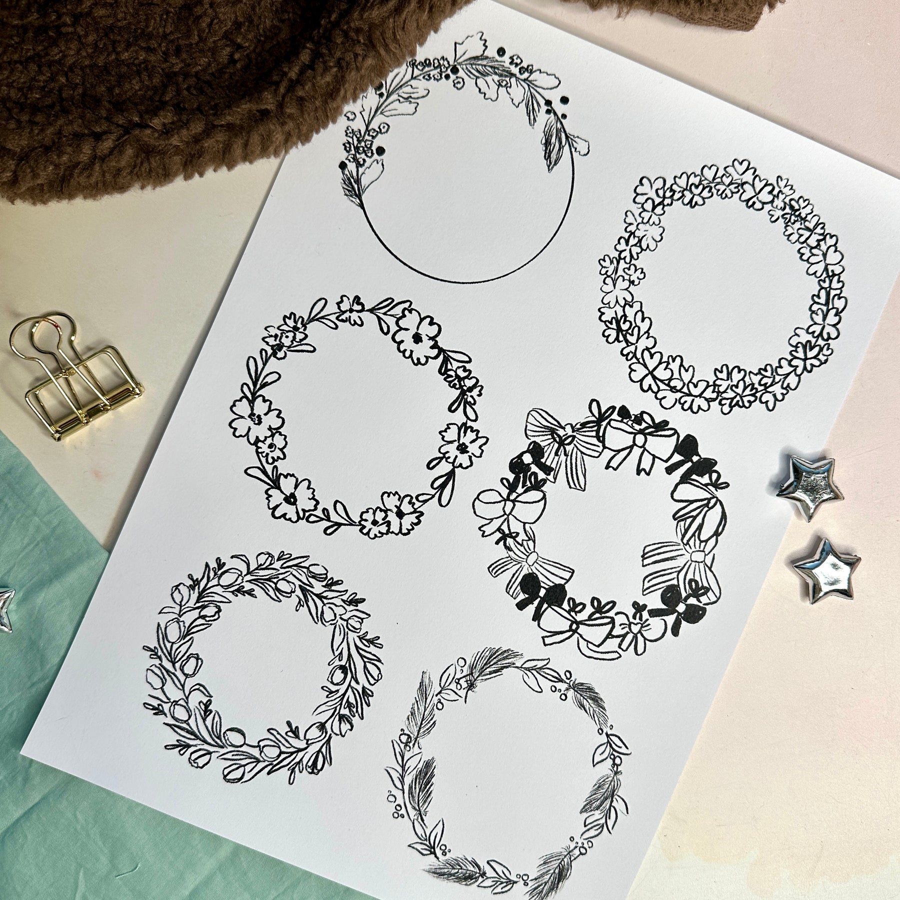 Im Vorlagen Paket findest du neben 6 Kranz-Vorlagen über 50 Doodles / kleine Illustrationen passend zur Kuschelzeit und dem Winter.